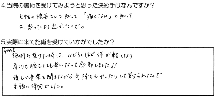初めて施術を受けた時は驚くほど身体が軽くなり、肩こりも腰もとても楽になって感動しました!